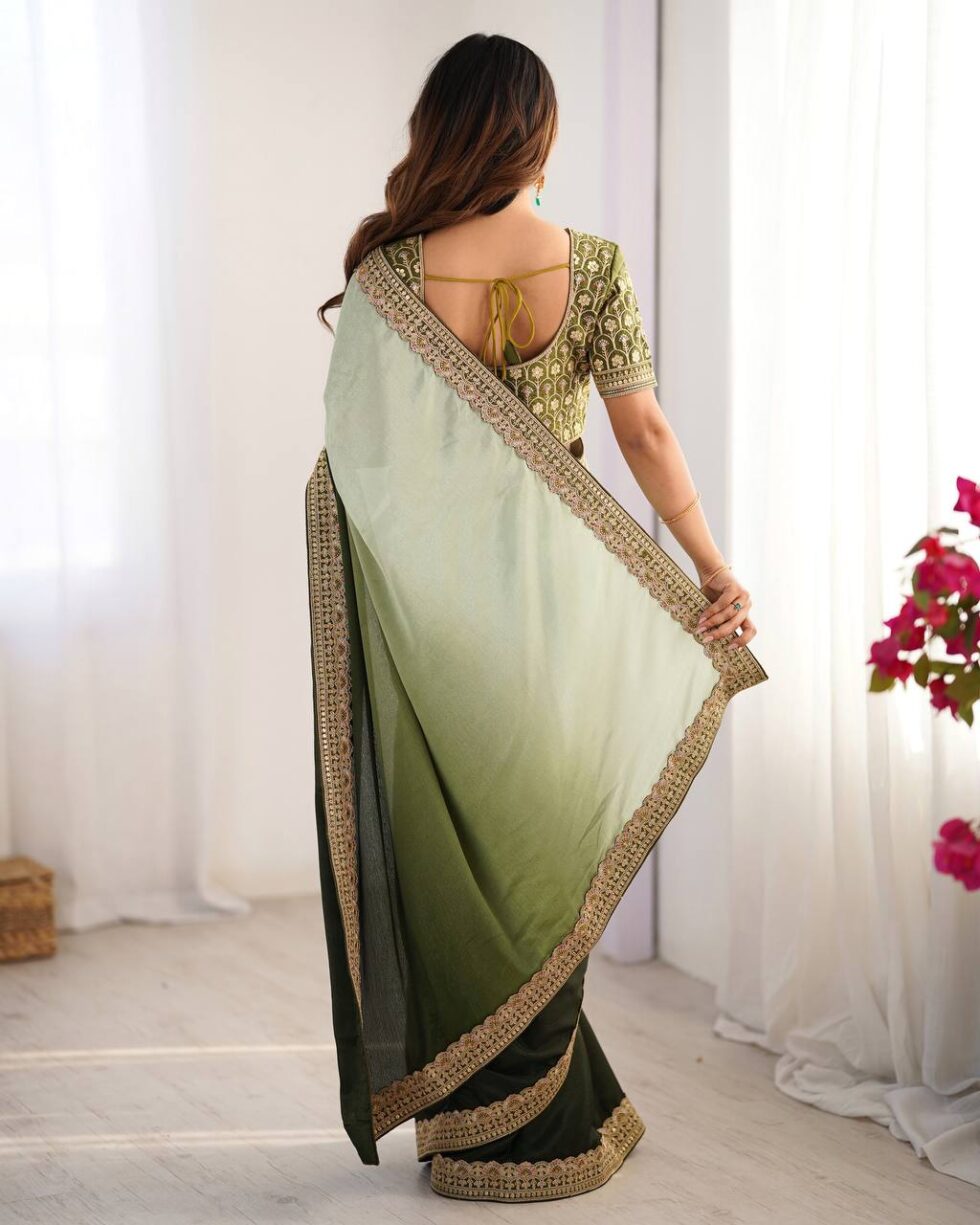 Women’s Elegant Ombre Green Georgette Saree with Intricate Golden Zari & Stone Embellishments – Complete with Heavily Worked Blouse for Festive & Wedding Wear